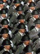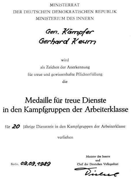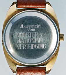 At the Armed Forces NVA (National Peaples Army) of the GDR (East Germany) there were very few typical military wrist watches. therefore here is shown a decoration watch of the GDR: - left: GUB Automatic cal.75 with dial ‘20 Years NVA’ (with tank, ship and aircraft on the dial). These were available in two case designs. - right: GUB ‘Bison’ Spezichron, cal 1126, back engraving ‘Donated by the Ministry of National Defence’. The NVA was formed in 1955 of the barracked Peoples Police, so had its 20th anniversary in 1975. The National Peoples Army and -Navy like the Air Force had mostly timepieces of the VEB Glashütter Uhrenbetriebe, as far as there were not timepieces in systems of Soviet origin. Timepieces of the USSR came mostly from the 'First Moscow Watch Factory'. Application: Most decoration watches came from Glashutte with the cal 75 or 1126 from Ruhla there more simple watches and quartz timepieces. They produced as well watches for combat divers especially for their border troops. - The document refers to the 'Kampgruppen' the milicia of the production organisations, thast were formed in every plant and factory., they were commanded by the Ministry of Inner Affairs. - The foto shows a parade of special NVA forces in Berlin. These decoration watches are rare and very interesting for collectors because of their historic references. The GDR has ended on 3. October 1990 by joining the Federal Republic of Germany. |
