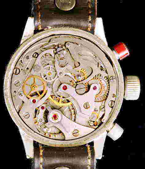 Fliegerchronograph Hanhart: Zwei Drücker (Cal 41) jeweils mit und ohne Lunette, schwarzes Zifferblatt mit Leuchtzahlen, vertiefte Sekunde und 30-Min.Zähler. Leuchtzeiger. Vernickeltes Werk mit Schraubenunruh und Incabloc-Stoßsicherung. Der Rückstelldrücker unten war häufig rot lackiert, um vor unbeabsichtigtem Rückstellen zu bewahren. Diese Uhren waren von ihrem äußeren Erscheinungsbild her weitgehend gleich, und es existierten mehrere Gehäusevarianten mit und ohne Drehringlünette sowie bei der Hanhart mit 1 oder 2 Chronodrückern. Einsatz: