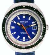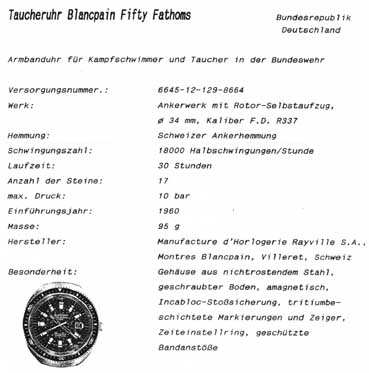 Die ersten Armbanduhren für Kampfschwimmer und Taucher in der Bundeswehr: Frühe Taucheruhren Blancpain Fifty Fathoms: Zifferblatt und Lunette blau, oder orange, Versorgungs-Nummer: 6645-12-129-8664, Ankerwerk mit Rotor-Selbstaufzug, 34 mm, Kaliber F. D. R337, Schweizer Ankerhemmung, 18.000 Hs/h, 17 Steine, max.: 10 bar, Stahl-Gehäuse, amagnetisch, Incabloc-Stoßsicherung, tritiumbeschichtete Markierungen und Zeiger, Zeiteinstellring, Einführungsjahr: 1960, Hersteller, Manufacture d’Horlogerie Rayville S.A., Montres Blancpain, Villeret, Schweiz. Da diese Uhren nicht voll antimagnetsch waren, mussten die Minentaucher die Uhren vor Annäherung an eine Mine ablegen. Die helle Farbe half beim Wiederfinden. Einsatz: